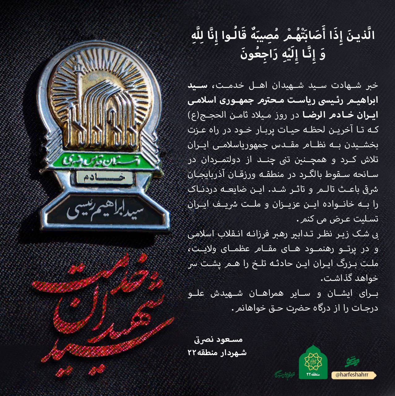 خبر شهادت سید شهیدان اهل خدمت، سید ابراهیم رئیسی ریاست محترم جمهوری اسلامی ایران خادم الرضا در روز میلاد ثامن الحجج(ع) که تا آخرین لحظه حیات پربار خود در راه عزت بخشیدن به نظام مقدس ج.ا.ا تلاش کرد و همچنین تنی چند از دولتمردان در سانحه سقوط بالگرد در منطقه ورزقان آذربایجان شرقی باعث تالم و تاثر شد. این ضایعه دردناک را به خانواده این عزیزان و ملت شریف ایران تسلیت عرض می کنم.